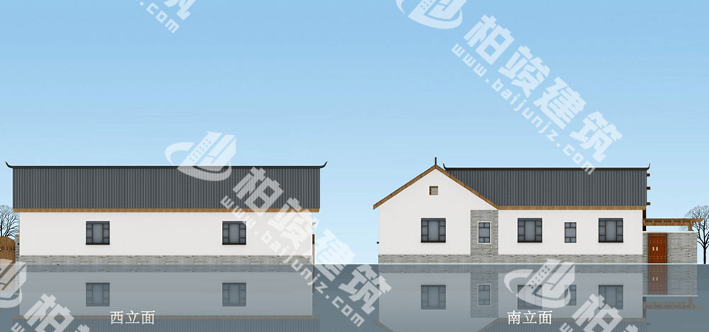 整体造型:坡形屋顶,黛瓦白墙,恬静写意,古韵悠然